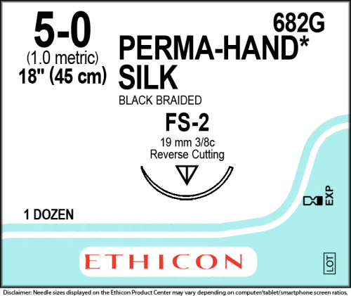 5-0 PERMA HAND BLACK 1X18" FS-2 Absorbability: NON ABSORBABLE Absorption Rate: NA Brand: PERMA HAND Category: Wound Closure Color: BLACK Control: NO Directionality: UNIDIRECTIONAL Length: 18in Material/Composition: SILK Needle Color: SILVER Needle Length (mm): 19mm Needle Name: FS-2 Pack Strand/Length: 1 x 18in Pledget: NO Pledget Size: NA QTY/BX: 12 Strands Per Pack: 1 Suture Size: 5-0